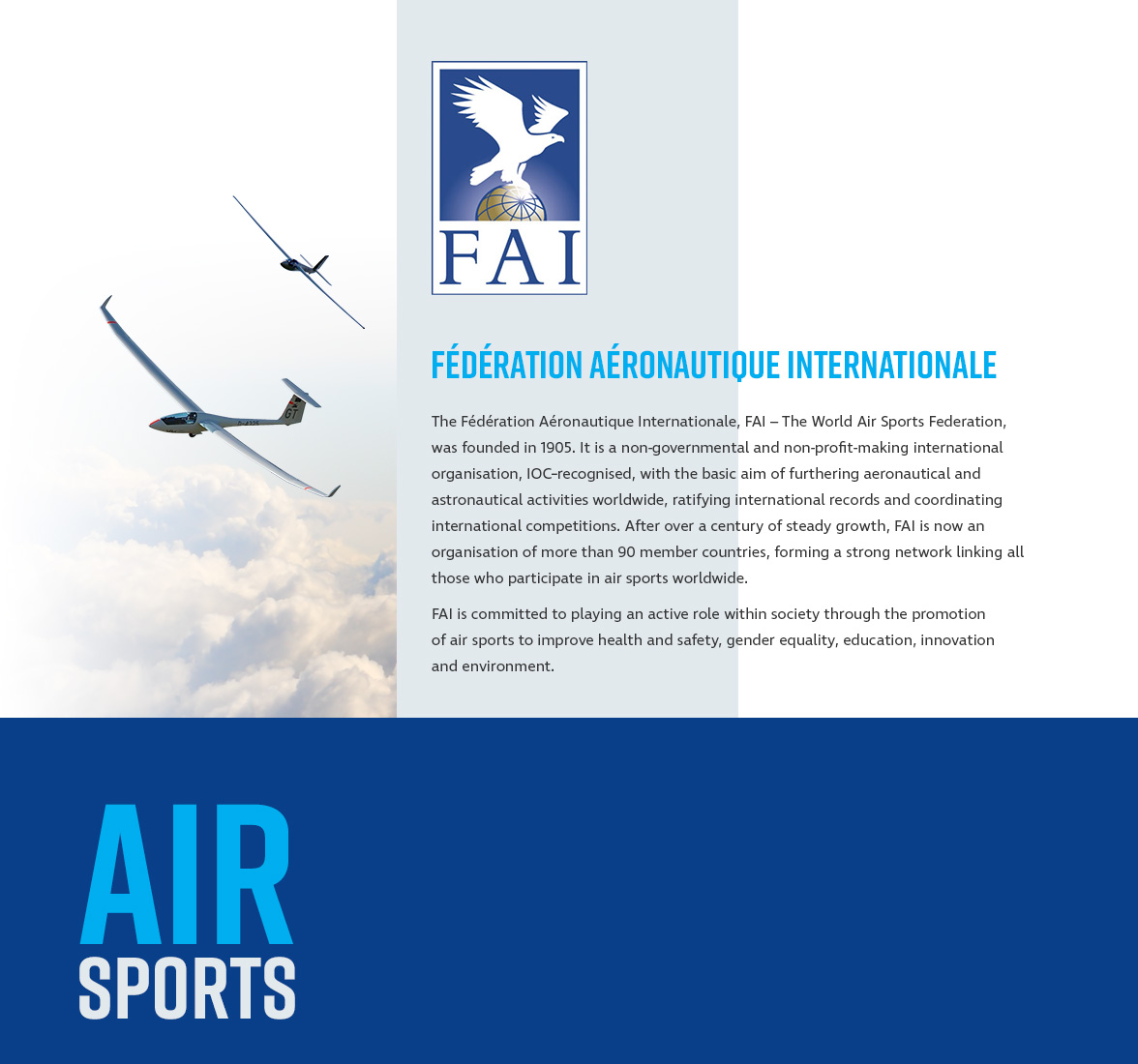 AeromodellingAmateur Built & Experimental AircraftBallooningDronesGeneral aviationGlidingHang glidingMicrolights & paramotorsParaglidingPower & glider aerobaticsRotorcraftSkydivingSpace Trending News See all news Twitter Facebook Events 24 Nov 2025 Day 1 at the 2025 FAI F1D European Championships for Indoor Model Aircraft Twitter Facebook Events 20 Nov 2025 Day 7 at the 47th CISM World Military Parachuting Championship Twitter Facebook Events 21 Nov 2025 Day 8 at the 47th CISM World Military Parachuting Championship Twitter Facebook Events 19 Nov 2025 Days 5-6 at the 47th CISM World Military Parachuting Championship Twitter Facebook Events 19 Nov 2025 Salt mine flights start next week at the 2025 FAI F1D European Championships for Indoor Model Aircraft in Slănic Prahova Twitter Facebook Events 18 Nov 2025 test Twitter Facebook Events 17 Nov 2025 Day 4 at the 47th CISM World Military Parachuting Championship Twitter Facebook Events 15 Nov 2025 Day 3 at the 47th World Military Parachuting Championship, Qatar Twitter Facebook Events 15 Nov 2025 The competition begins! 47th CISM World Military Parachuting Championship, Qatar Twitter Facebook FAI Young Artists Contest 11 Nov 2025 Faustine test Social media: Contact Us NewsletterGeneral conference Rankings EnvironmentEducationMedico-physiological