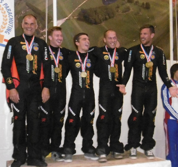 Once the medal ceremony was completed, Simon Woerlee, Meet Director, called all Gold Medal winners to the podium where they were presented with bottles of champagne. The audience scattered. The formal end to the Competitions was declared by Dr. Rainer "Exi" Hoenle, FAI Controller and 1st Vice-President of the IPC. The FAI Flag was lowered whilst the anthem played and it will be handed over to the meet director (not present) of the next FAI First Category Event in Parachuting; namely the 1st FAI World Championlships in Indoor Skydiving to be held in Prague (Czech Republic) 21-24 October 2015.