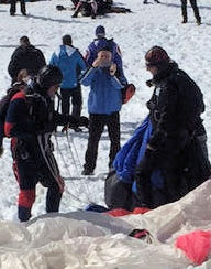 The morning started early with the Qualification Ski Run - all went well and the start lists for tomorrow's competition are ready. At 12.00 those at the accuracy target area heard the announcement that the helicopter would arrive in 10 minutes with the first WDI load. Fifteen minutes later the first team of the day took off. The Netherlands Team were the first in the air and the picture is of the first competitor landing. By 15.45 two rounds of accuracy had been jumped and competitors and officials started to make their way down the mountain to ensure they are ready in time for the Opening Ceremony. It has been a beautiful day with lots of sun, no wind and a few clouds.