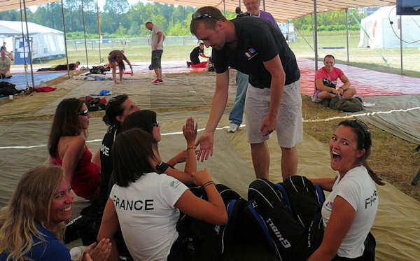 In the packing tent when the French Girls realised they were still one jump away from a Gold or Silver medal.