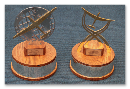 The trophies feature a glider in bronze mounted on a wooden stand.