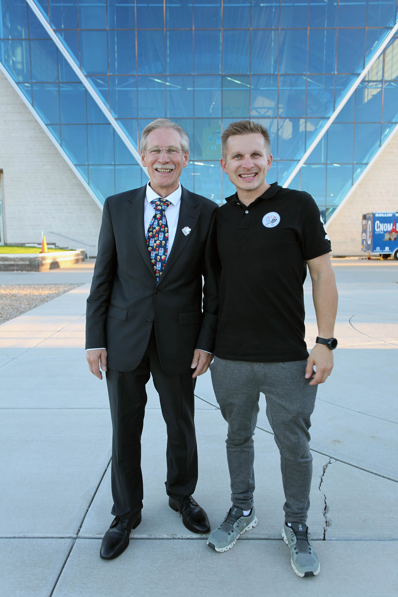 Following Sullivan’s remarks, Master of Ceremonies and fellow Albuquerque balloonist Troy Bradley invited Wilhelm “Willi” Eimers to the stage. Eimers was inducted into the FAI CIA Hall of Fame in 2021, but U.S. COVID restrictions prevented him from attending the induction ceremony. Eimers and his son Benjamin “Benni” took first place in this year’s Coupe Aéronautique Gordon Bennett, and the two were both scheduled to compete in the America’s Challenge. Eimers said a few words of appreciation and told the story of how he became a gas balloon pilot.
