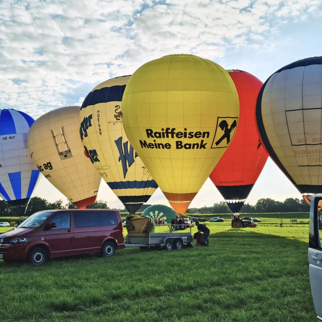 Spectators can also experience the excitement of the Fly-In of the balloons around 6:30 PM. Here, a target cross will be laid out, and the pilots must drop a marker on this target cross. It's very exciting to see 35 balloons suddenly floating in the middle of Wieselburg. After the Fly-In, there will be a raffle drawing – with balloon rides to win: