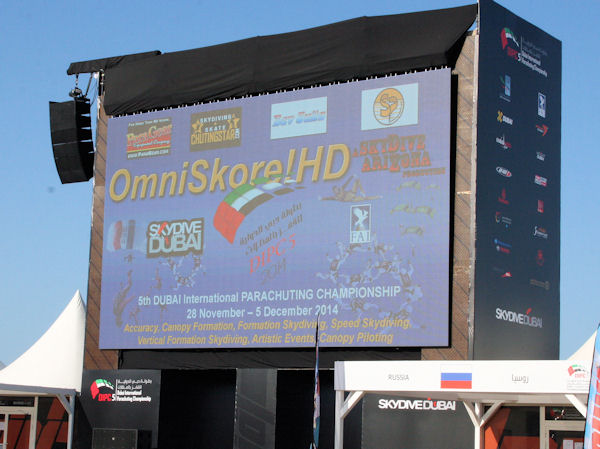 On the Drop Zone there are three huge screens.  This year these will be organised with one dedicated to OmniSkoreHD which will show the judging of Formation Skydiving, Canopy Formation and Artistic Events with a running results sequence for those disciplines.  One of the screens is dedicated to Dubai Sports TV which will be broadcasting all day from here and will also be live streaming to the organiser's web site.  The third screen will be used by Skydive Dubai to show their daily videos and a mixture of on site images, etc.