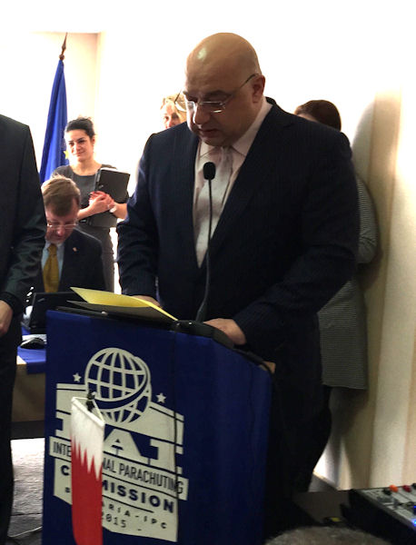 The formal opening of the meeting took place with a range of dignitaries from Bulgaria. The first speaker was the Vice-Prime Minister of Bulgaria, Tomislav Dontehev, who for the purposes of protocol welcomed all the delegates in Bulgarian, then proceeded to make his own translation. He welcomed everyone to the meeting in Bulgaria and also spoke of how pleased they were to host the World Cup in Accuracy Landing and Freefall Style in 2015 at Edren, Montana. He was not a skydiver, but he loved a challenge and therefore he was making a public promise that he would make a jump. This was greeted with enthusiasm and support by the delegates present.