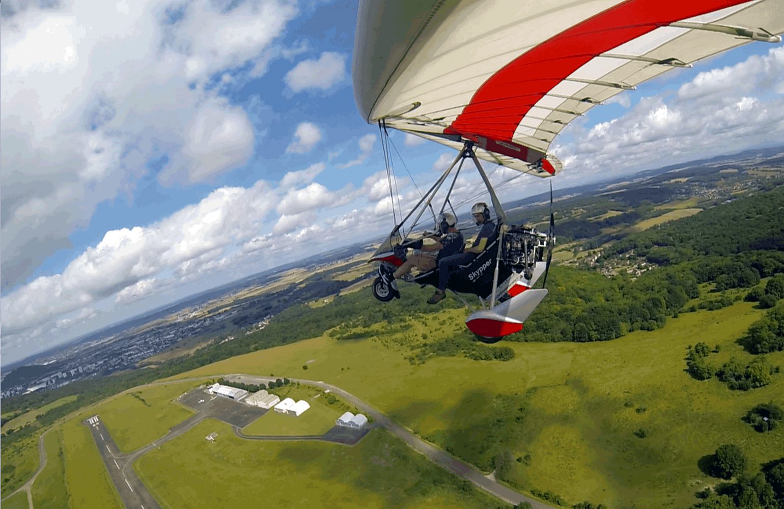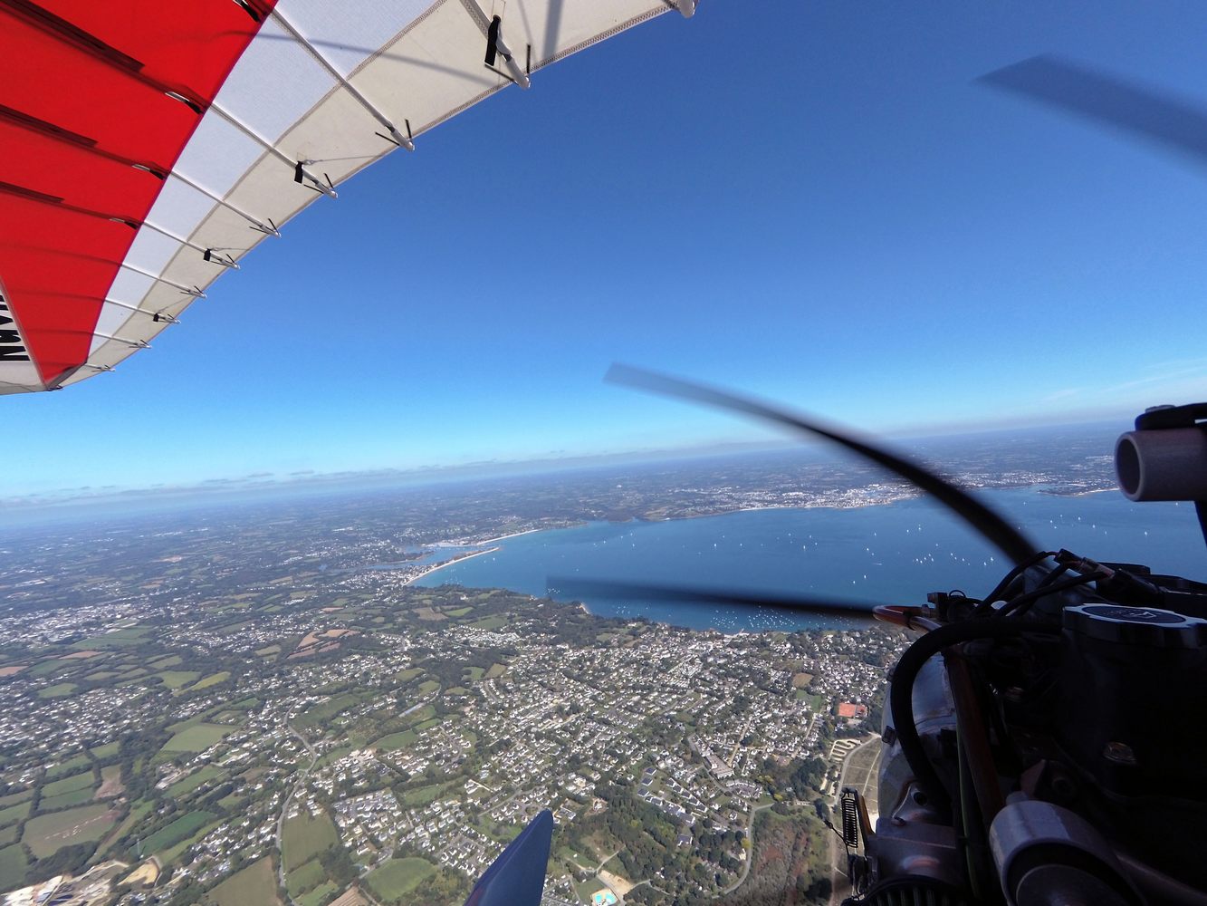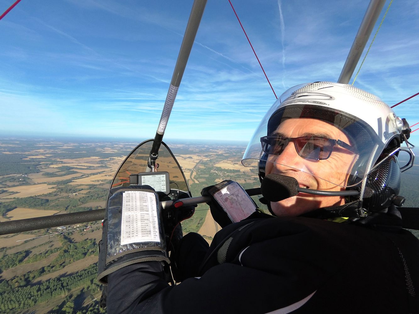 The most difficult part of the flight? "[It] was probably after crossing the halfway point near the Loire Valley. It was the last of the really hot weekends of the summer 2019 and we were obliged to descend quite low due to airspace restrictions and therefore into some very strong afternoon thermic activity. Strong thermals in themselves are not such a big problem for hang glider and paraglider pilots such as myself and Louis, but at low level in a 400+ kg machine at 90km/h it can be a little disconcerting. Although a flex-wing microlight is perhaps one of the simplest and most intuitive aircraft to fly, it is also the most physical. In order to stay on good form, Louis and I took turns to eat, drink and even pee whilst helping each other control of the aircraft. Throughout the afternoon we fought through the thermals and then the convergence over the Bretonne peninsula. Above 3000ft this was bearable, but at lower levels, at certain moments, we both needed all our strength to keep the machine on course."