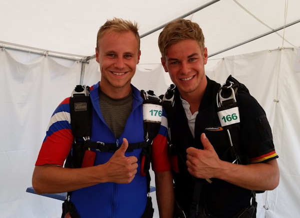 Christoph Zahler (GER) and Alessandro Binello (ITA) (above), about to make their Round 8 Junior Male accuracy jumps, epitomise the spirit of the Championships - enthusiasm, comradeship, determination and pride.