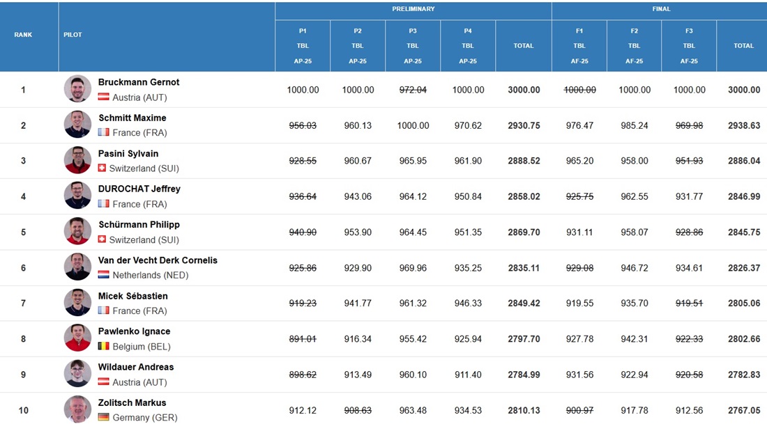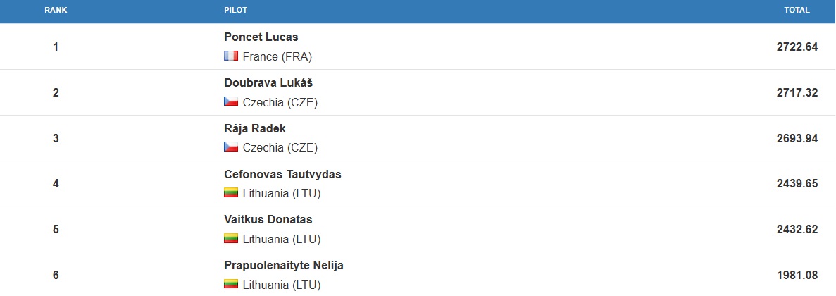 Among the juniors, Lucas Poncet of France came out on top (and 15th overall), followed by two young Czech pilots: Lukáš Doubrava and Radek Rája.