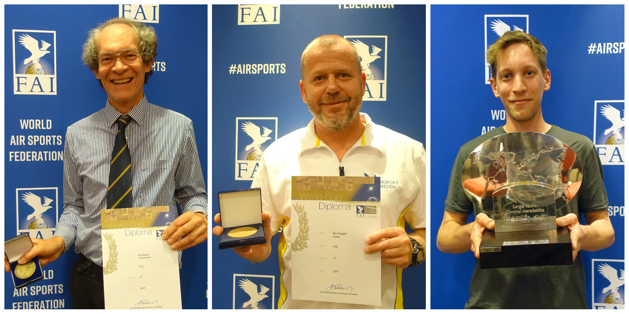 Photo captions: top picture, for left to right: Drone Racing Subcommittee Chairman Bruno Delor, FAI Secretary General Susanne Schödel, Drone Racing World Cup 2017 winner Dario Neuenschwander, FAI Executive Director BengtLindgren; 2nd picture, Ian Kaynes (GBR), 3rd of the F1Q World Cup, Per Findhal (SWE) winner of the F1A World Cup, Emilien Galley (SUI), winner of the F3M RC Large Aerobatic Aircraft World Cup