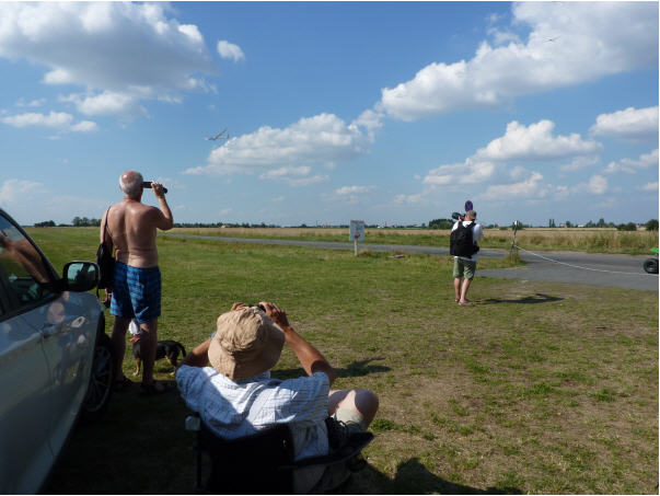 Each day, as anxious crews muster at the finish ready to remove their pilots and gliders from the active runway as fast as possible, visitors from the town arrive, often with grandchildren or friends, to peer into the bright sunlight and glider-spot. A fine display thrilled them yesterday as sometimes 7 or 8 gliders at a time swooped towards the airfield, whooshing over the ripe corn at the runway threshold, some very low (did you see that, Robert?) and some with wingtips turned up so high at speed that the glider seemed bowed and the tips about to “clap hands”. Jettisoned water streamed behind those who had held onto to their water ballast until the last, some even to touch-down.