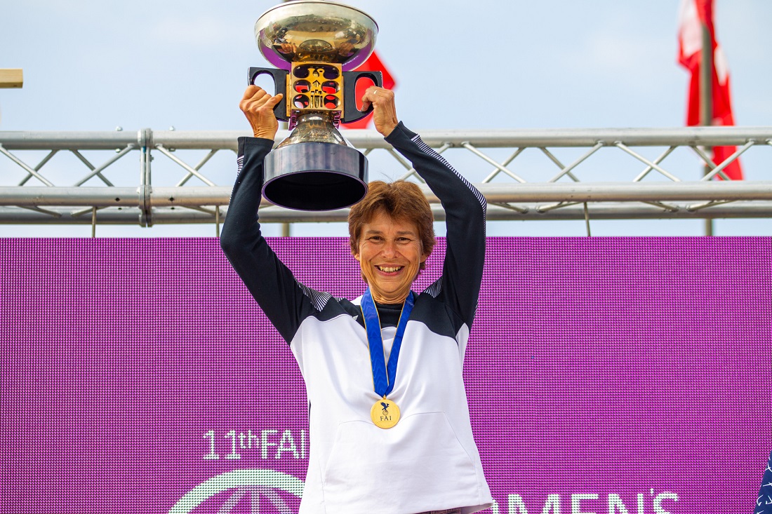 Conny lifts her trophy at the 2022 FAI Women's World Gliding Championships