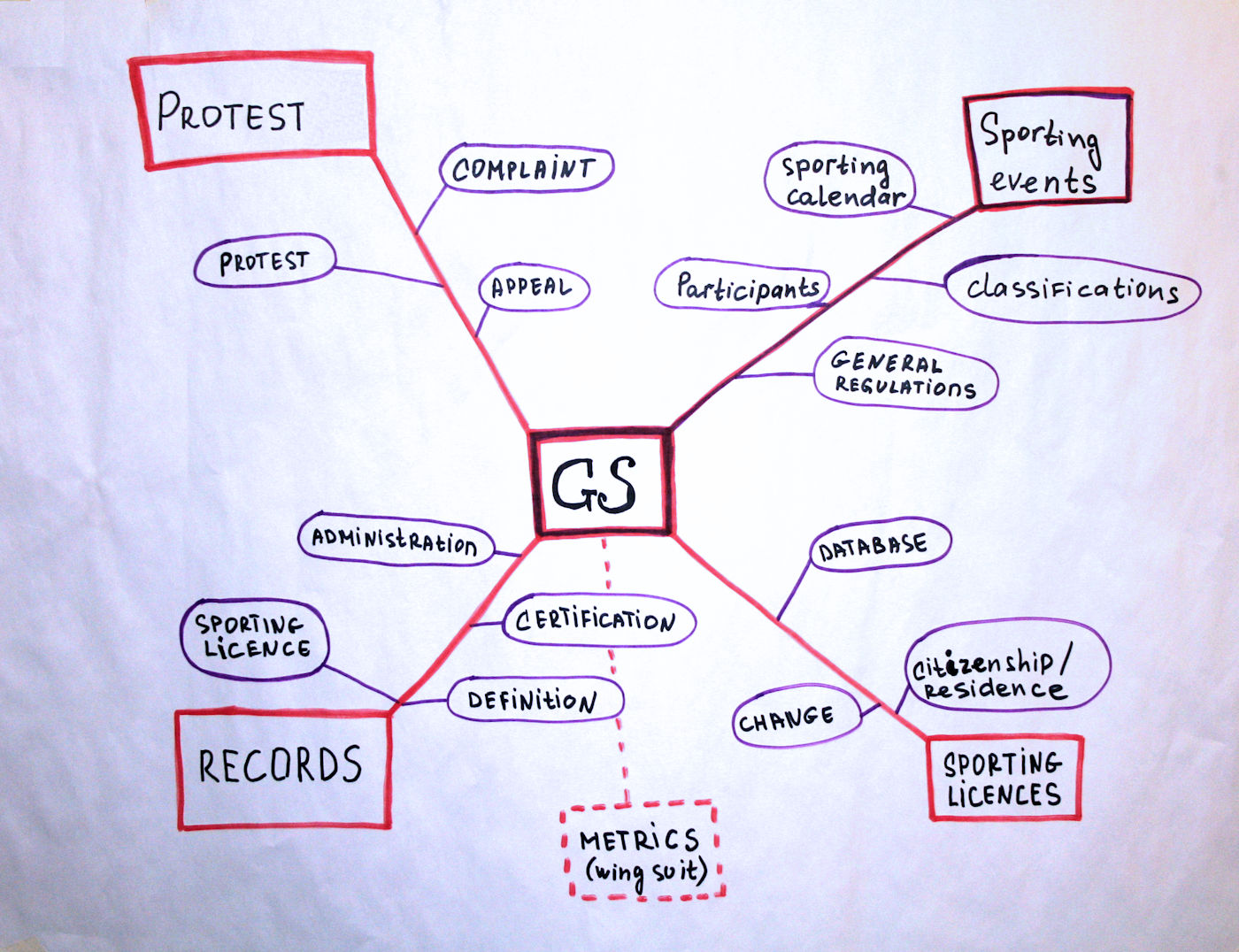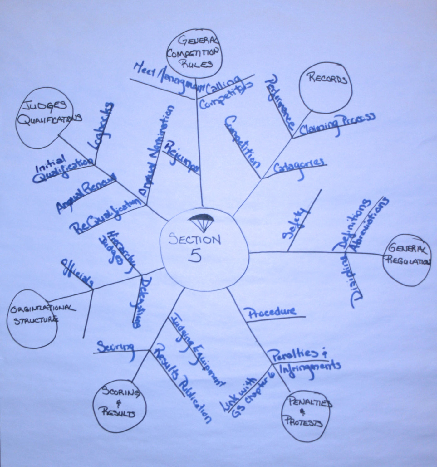 The goal of the workshop is to arm the judge trainers with a digital tool-box comprising aspirational guides and aide memoires, with the first practical lesson being an introduction into 'mind-mapping' which will be one of the tool-box documents. A mind map is a diagram used to visually organise information. It is hierarchical and shows relationships among pieces of the whole. It is created around a single concept, drawn as an image in the centre of a blank page, to which associated representations of ideas such as images, words are added. Major ideas are connected directly to the central concept and other ideas branch out from those, often using a different colour to emphasise each branch network. Using this approach Karla tasked two groups to formulate a mind-map, one group tackled the General Section, whilst the other dealt with Section 5. The assignment soon had each group brainstorming for all their worth, resulting in the following mind-maps.