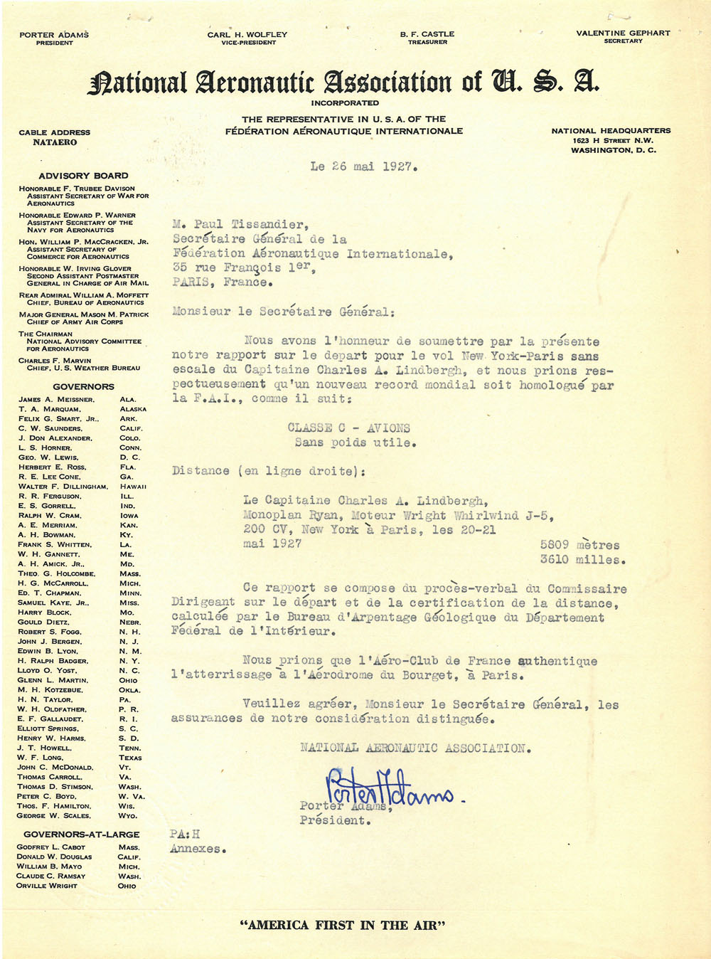 Dated 26 May 1927 and addressed to Monsieur Paul Tissandier, then Secretary General of the FAI, it reads: “We have the honour of submitting our report on the New York-Paris flight, flown by Captain Charles A Lindbergh, and we respectfully ask that this new record is homologated by the FAI.”