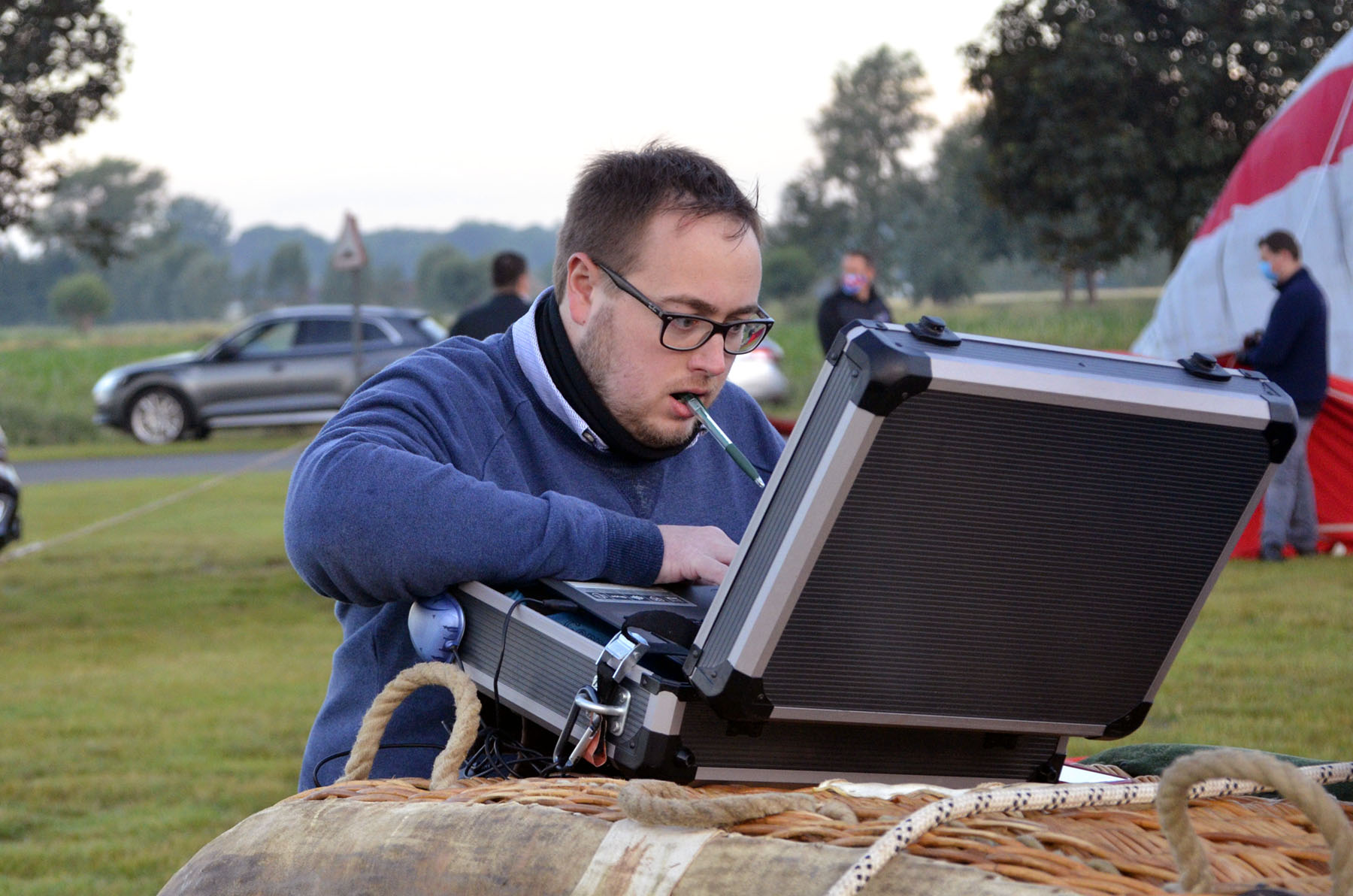 In the background you can see crew setting-up another balloon wearing masks.
