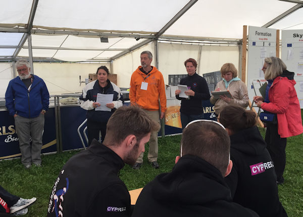 There was considerable discussion about the publication of the scores immediately, particularly in the case of part rounds for 4-way being jumped to leave those also involved in 8-way clear for a quick call. Some competitors felt that when teams were in close competition it gave an advantage of one over the other to know what had been scored. There was no common concesus regarding this as the majority of competitors present seemed content to leave it as it was. Again there was discussion, led by the Americans regarding being asked to jump in cloudy conditions on safety grounds, although most European teams are used to these conditions. The rules give the right to a team to come down with the aircraft if they chose not to jump for a 'pertinent reason'. There is pressure also on the Organiser to complete the competition safely.