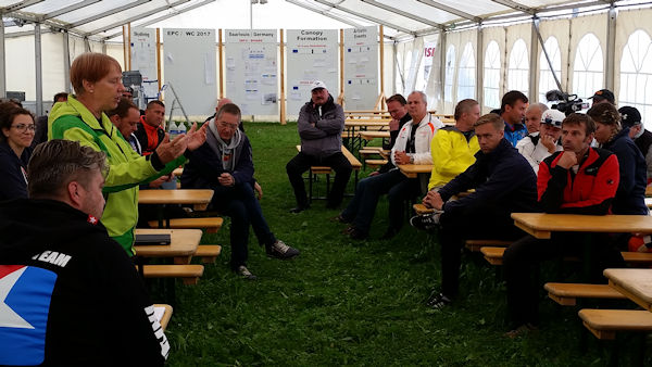 14.00hrs: At the competitors' meeting for Speed Skydivers Chair of the Speed Skydiving Committee, Elisabet Mikaelsson addressed the competitors, firstly by acknowledging her committee members namely: Moritz Friess, Arnold Hohenegger, Alyia Ananina, Mike Lovemore, Kate Charters and Holger Enderlin.