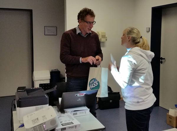 Karla presenting Helmut Bastuck with a thank-you gift for his extensive help
