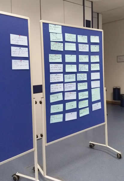 The first task for the participants was to write down on cards those questions which they themselves felt needed addressing. It wasn't long before the board was adorned with blue cards, though it was likely that many of the cards ie questions, would disappear as the topics were addressed over the weekend.