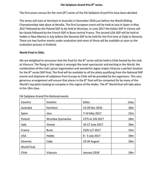 FAI Sailplane Grand Prix Schedule for 8th Series