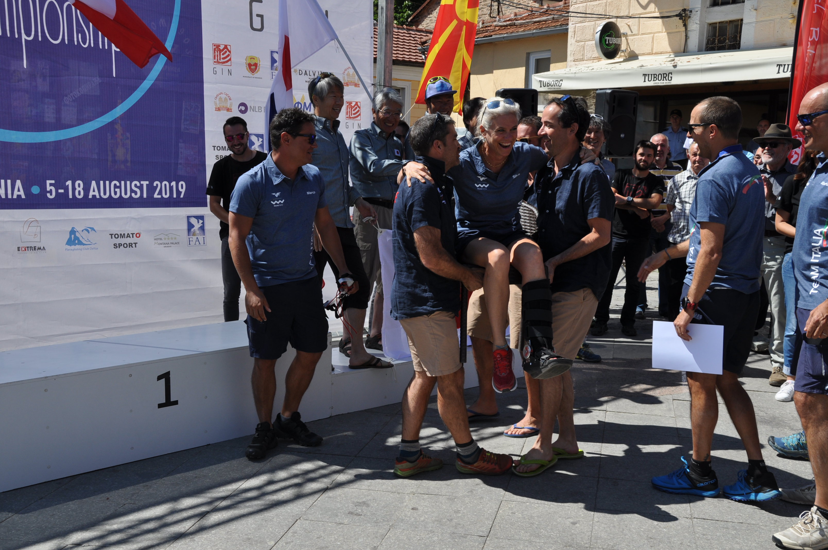 French pilots Charles Casaux and Julien Wirtz are bringing to podium Italian pilot Silvia Buzzi Ferraris, who was injured but continued flying in the competition.