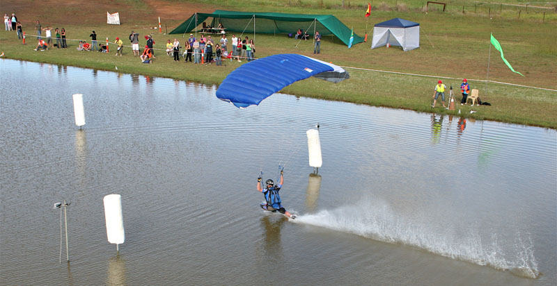 Parachuting Canopy Piloting involves a series of tasks designed to test a parachutist’s ability to control his canopy and fly accurately. Pilots compete over a stretch of water for safety reasons because of the high speeds involved - at the same time creating spectacular action as the parachutists whizz across the surface of the water, leaving a plume of spray behind them.