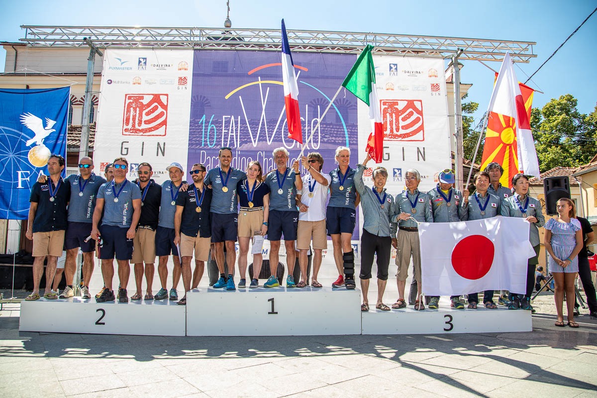 In paragliding competition, each team is made up of four pilots, with the top two pilots in each team contributing to the team score each day. By the end of the competition, France and Italy had both scored 18,821 points over the two weeks – an incredibly tight finish. Japan was third and wins bronze; there is no second-place silver medal awarded.