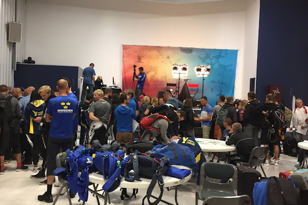 Today is registration day, Judges Conference and practice jumping. The judges arrived at 7.30 in the rain. By 12.30 the first aircraft load was called and we had broken cloud and blue skies. The registration has been set up in the Auditorium and was a very busy place, with lots of staff on hand to help with the process.