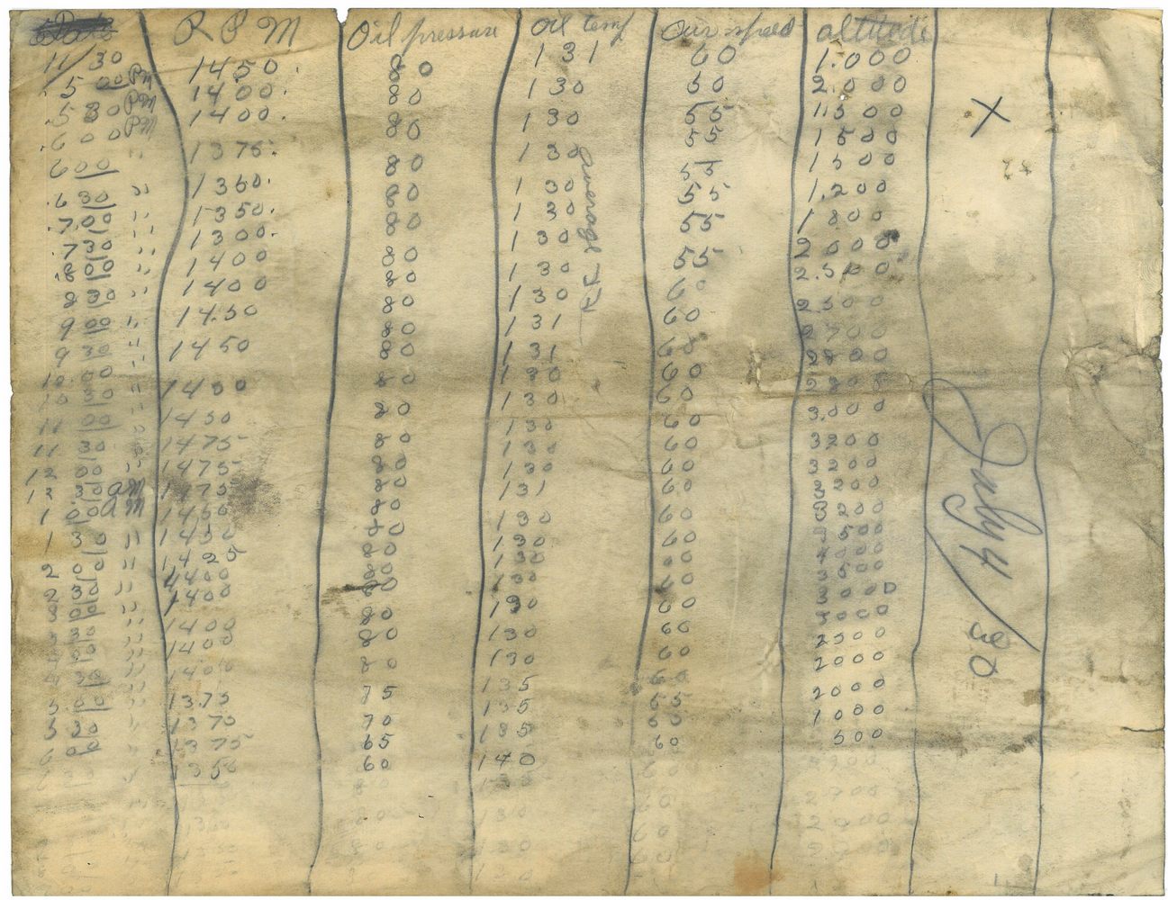 Time, engine revolutions, oil pressure, oil temperature, speed and altitude log written down by the pilots on 4 July 1930, the last day of the flight