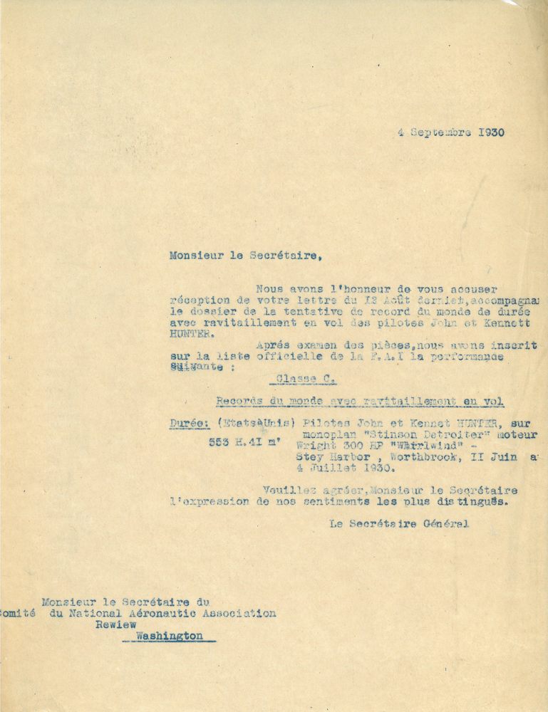 Letter to the National Aeronautic Association of USA confirming the ratification of the record by the FAI