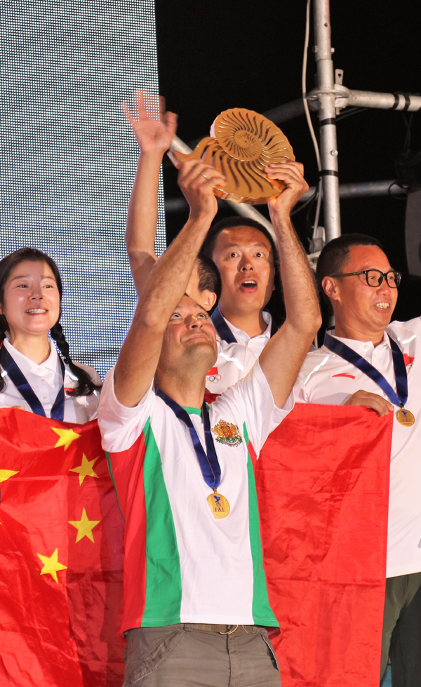 The closing ceremony was a televised spectacular media event with prizes and trophies being presented by several leading Albanian VIPs and politicians. These included the Ministers of Culture, Energy and the Mayor of Vlora. Actor Inva Mula gave Nunnapat Phuchong a beautiful ‘Golden Woman’ award. The FAI President, Frits Brink, presented the Team Gold Medals and the Prime Minister of Albania, Edi Rama, presented Tzvetan with a Gold Shell trophy.