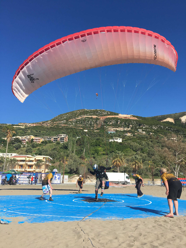 9th FAI World Paragliding Accuracy Championship in Vlora (Albania) has made 8 rounds by now and has 3 more days to go. It remarkable that after 1176 flights in the competition to date, there have been 85 zero scores (actually landing on the 2 centimetre diameter central disc), with 776 scores on the electronic measuring ‘pad’ (landing within 16cms from the edge of the disc).