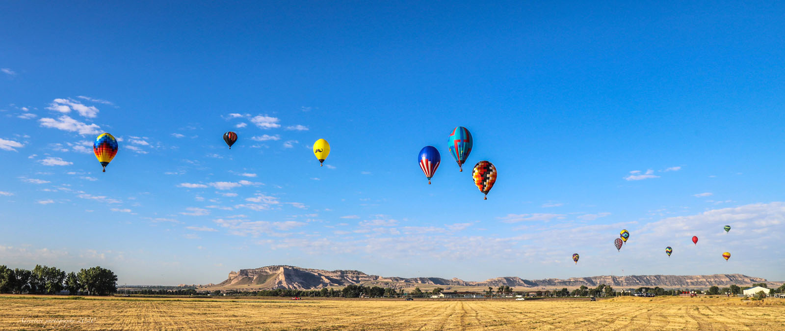 Balloons flying competition with the beautiful National Scottsbluff monument in the background.