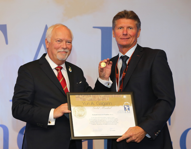 Gennady Padalka, who received the Yuri Gagarin and the De La Vaulx Medals said: "It is a great honour to be here but it is not only a personal award, it is an award for all my team, engineers, technicians who deserve it for the work they did. I really much appreciated the Ceremony, this was my first Ceremony of this kind, and I want to come back every year!"
