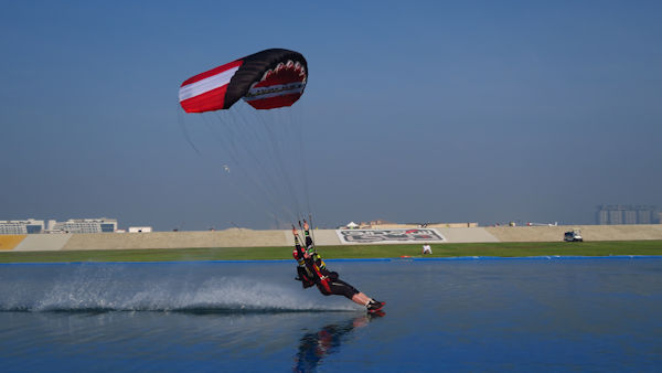 We started with the first round of the Canopy Piloting Freestyle - the fun event, for both competitors and spectators - at least the water is warm!  In the first round each competitor performed a move from the list of named and known moves with interesting names like "Lazy Boy" and "Boomerang" and these moves require both physical body control and canopy control with marks awarded for both technical execution and performance style.  We completed the first round at the end of the allotted 45 minutes.  This afternoon our slot has been changed slightly to 14.30 (from 15.00) and finishing earlier to make way for the Air Show this afternoon from the UAE air force demonstration team.