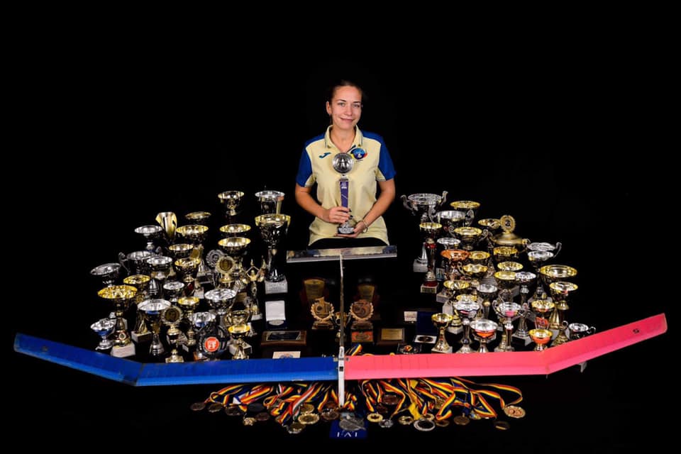 ![]() Tamara Kiss, Junior Free Flight Champion, showing her Rookie and trophies |